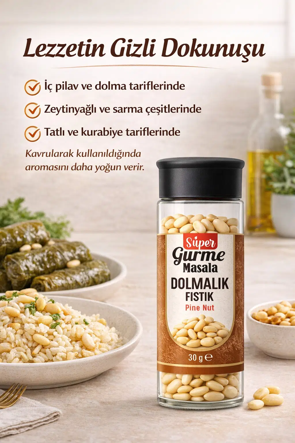 Bergama çam fıstığı, dolmalık fıstık 30 gr cam ambalaj seçeneği ile mutfakta ölçülü ve taze kullanım sağlar.
