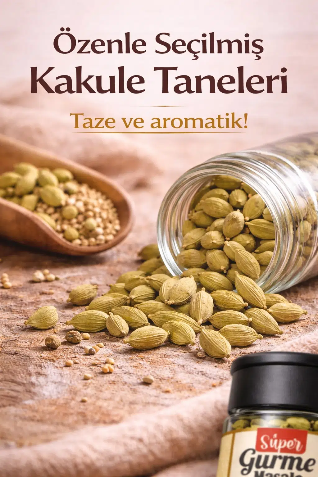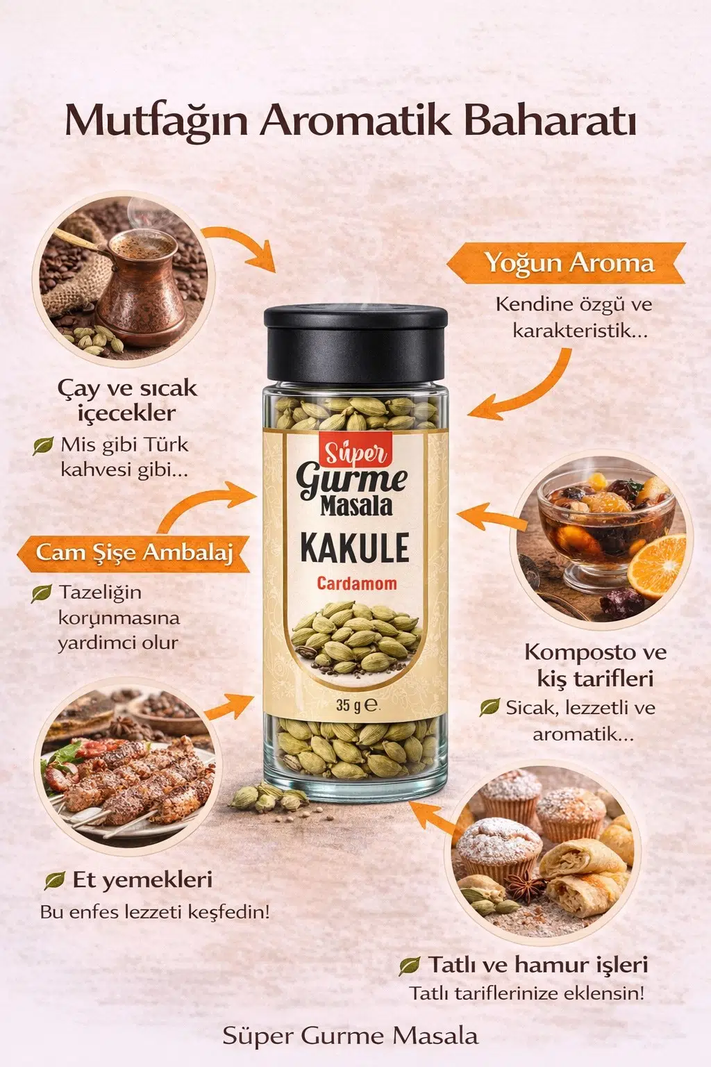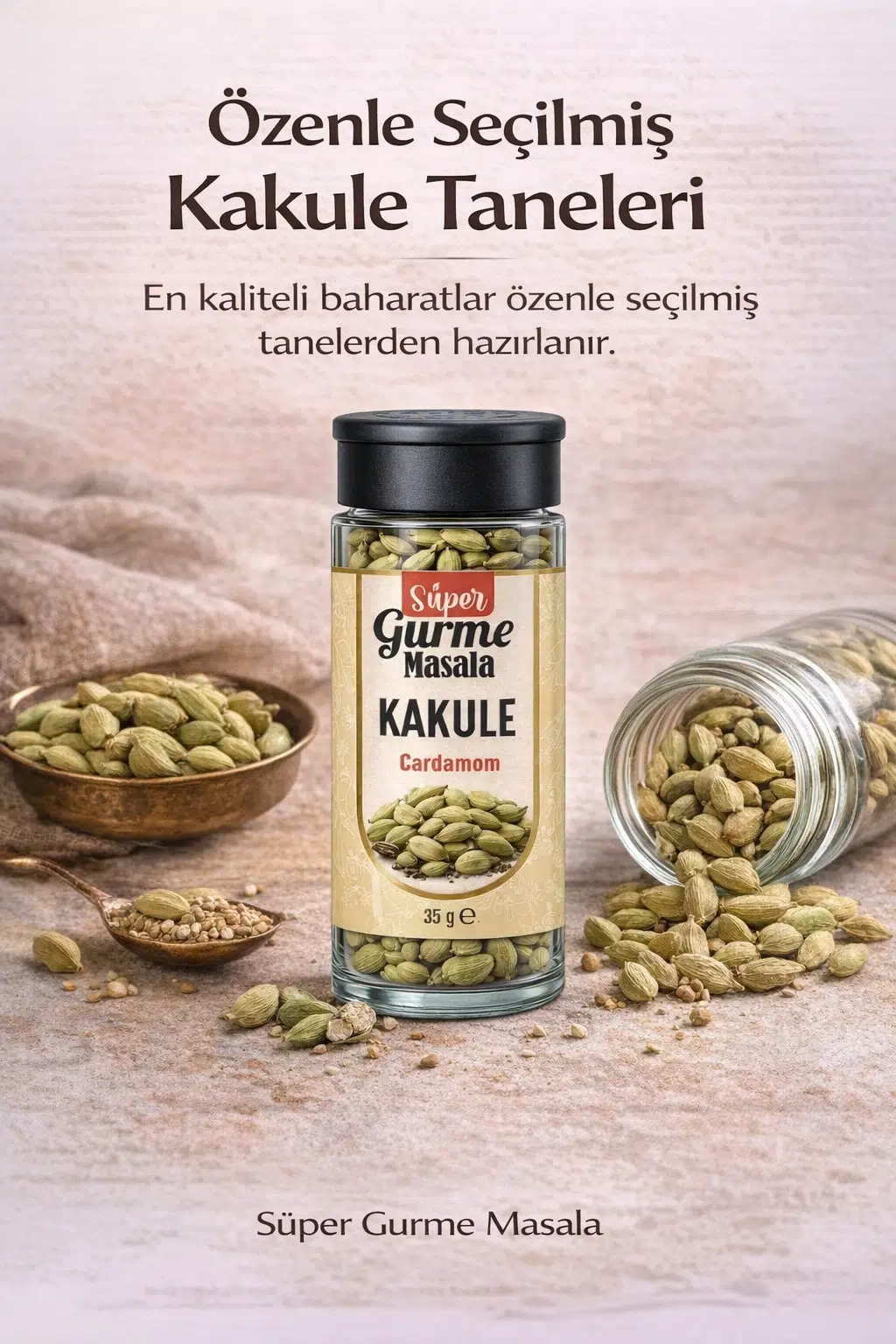 Super Gurme Masala Kakule Tane 35 g, kendine özgü yoğun aroması ve karakteristik kokusuyla mutfaklarda sık kullanılan değerli baharatlardan biridir. Özenle seçilen kakule taneleri cam şişe ambalajda sunularak tazeliğin korunmasına yardımcı olur.