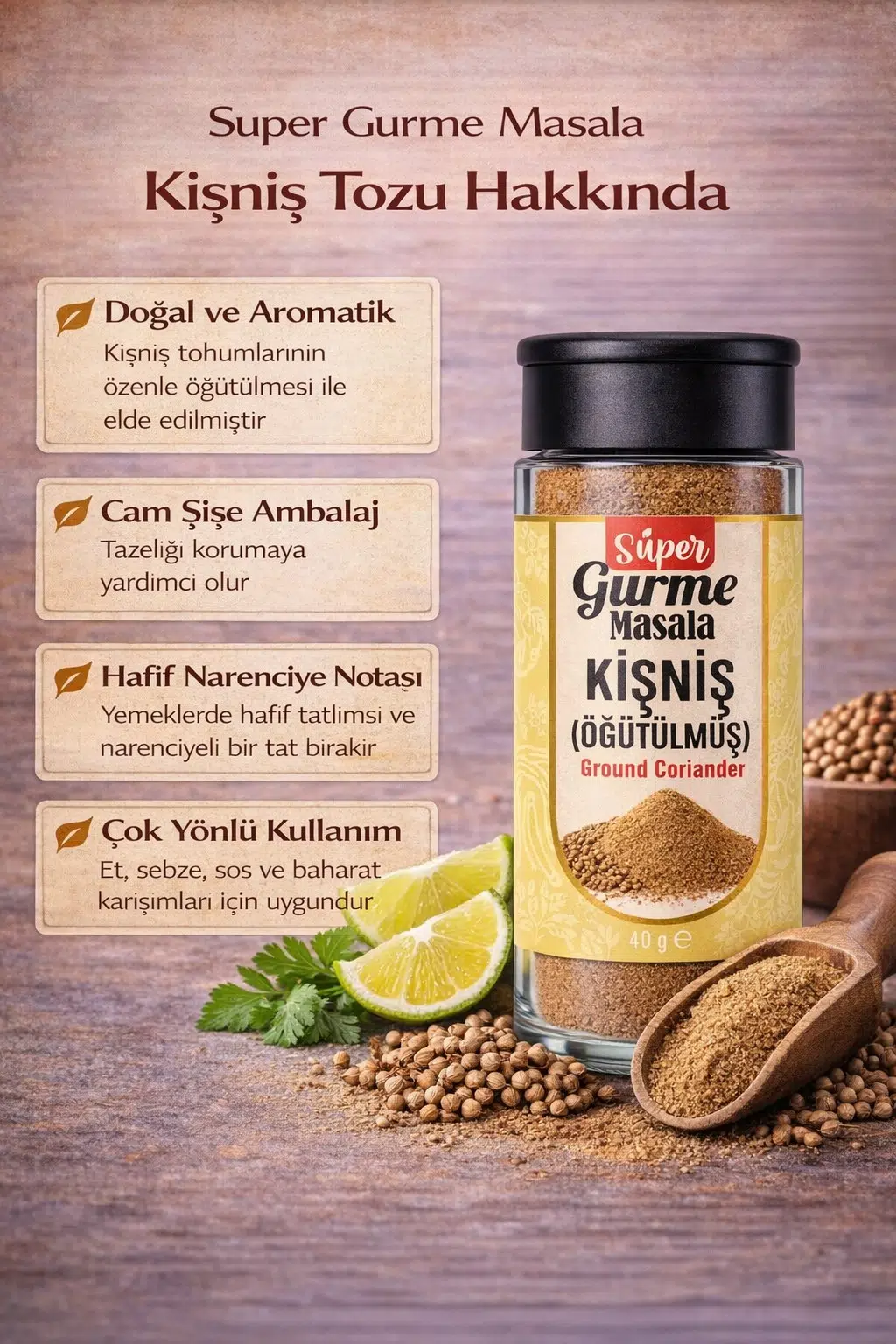 Super Gurme Masala Kişniş Tozu, kişniş tohumlarının öğütülmesiyle elde edilen aromatik bir baharattır. Hafif narenciye notaları ve kendine özgü kokusuyla birçok yemek tarifinde tercih edilir.