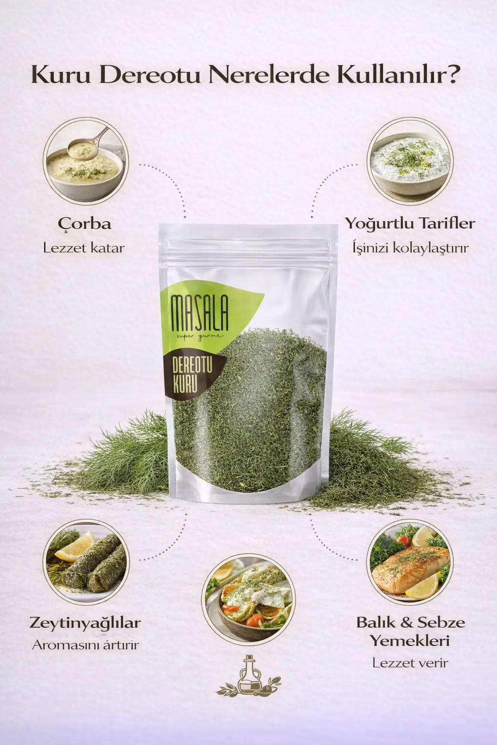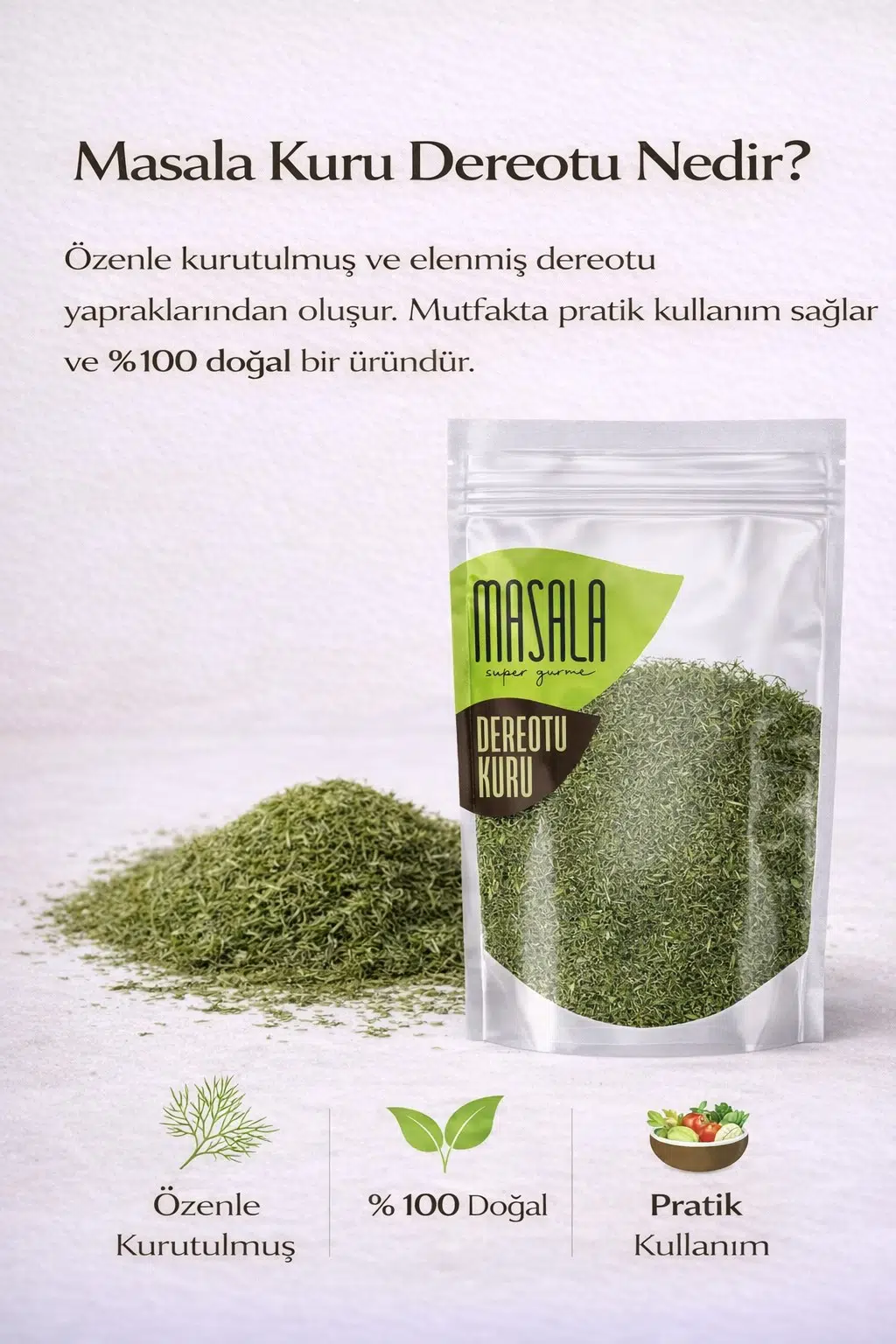 Kurutulmuş dereotu, taze dereotunun aromasını ve karakteristik kokusunu koruyacak şekilde özenle kurutulmasıyla hazırlanır. Yemeklere pratik kullanım sağlayan yapısı sayesinde çorbalarda, salatalarda, soslarda ve sıcak yemek tariflerinde tercih edilir.