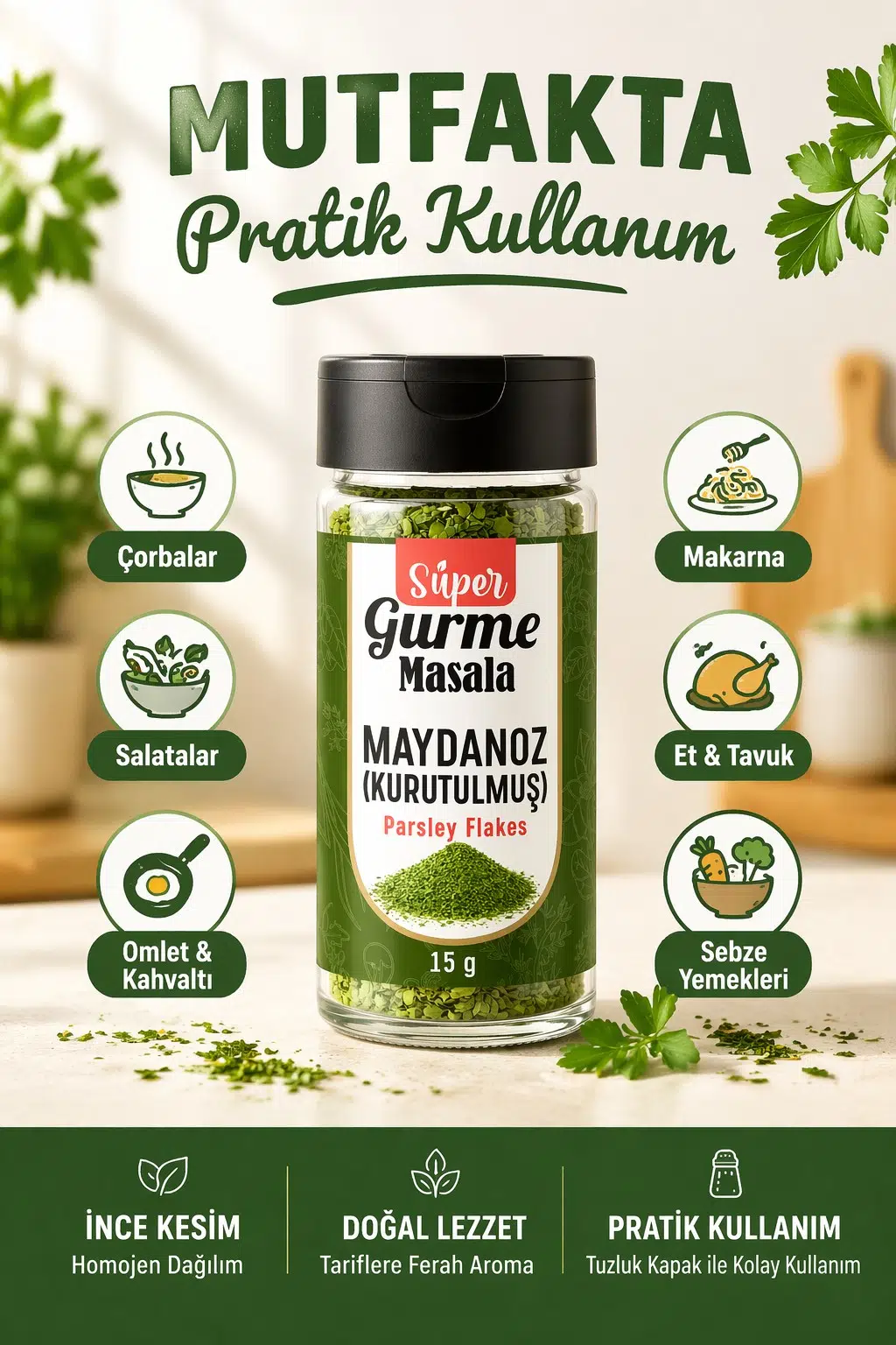 Süper Gurme Masala Kurutulmuş Maydanoz, özenle seçilip kurutulmuş yaprak formu sayesinde mutfakta pratik ve kontrollü kullanım sunar; cam şişe ambalajı ürünün tazeliğini korurken tuzluk kapak yapısı ile istenilen miktarda kolayca kullanım sağlar, ince kesilmiş yapısı sayesinde çorba, salata, omlet, makarna ve çeşitli yemeklerde homojen şekilde dağılır ve tariflere dengeli bir görünüm kazandırır, serin, kuru ve güneş görmeyen ortamda saklanması önerilir.