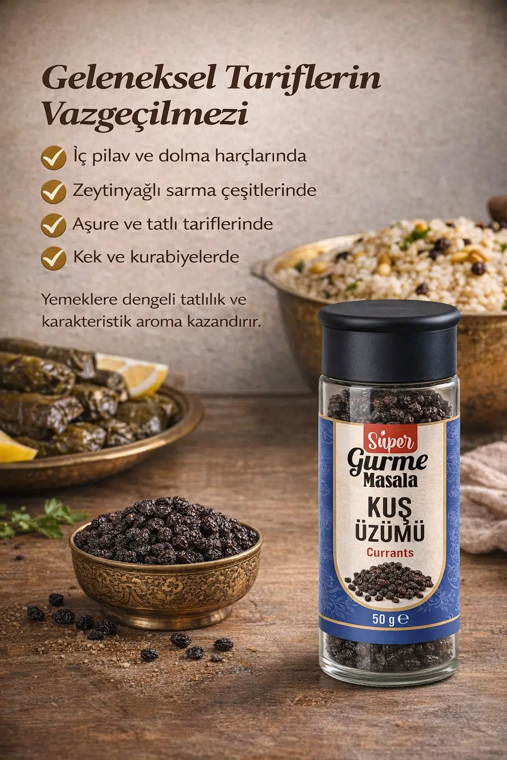 Masala Kuş Üzümü, özenle seçilmiş ve kurutulmuş tanelerden oluşur. 50 gr cam kavanoz ambalajında hijyenik ve pratik kullanım sunar. Küçük, koyu renkli ve aromatik yapısıyla hem geleneksel hem modern tariflerde tercih edilir.