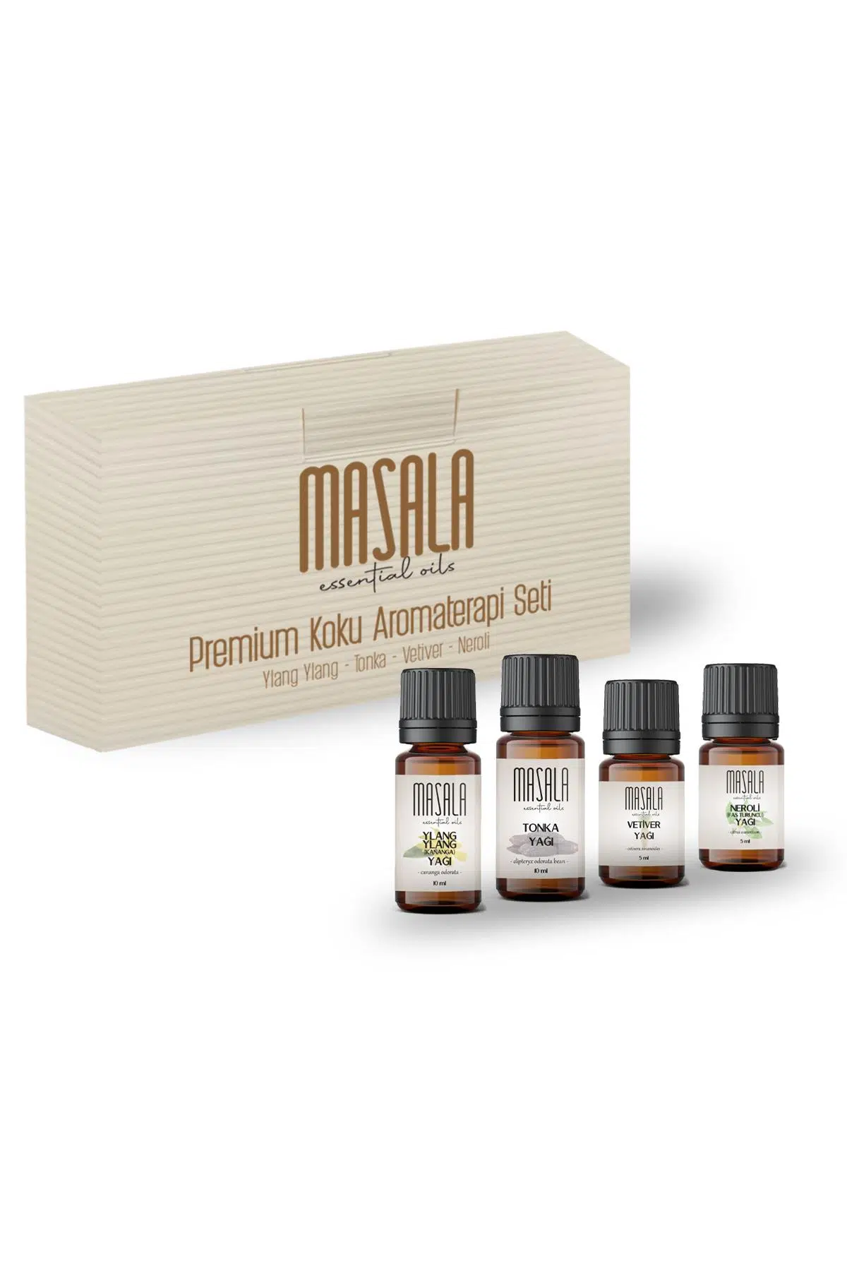 Masala Premium Koku Aromaterapi Seti, parfümsü ve sofistike aromalarıyla öne çıkan dört özel uçucu yağın bir araya getirildiği seçkin bir koleksiyondur. Bu set; sıcak, çiçeksi, topraklı ve narenciye notalarının dengeli uyumunu sunarak aromaterapi ve koku harmanları için üst segment bir deneyim sağlar.