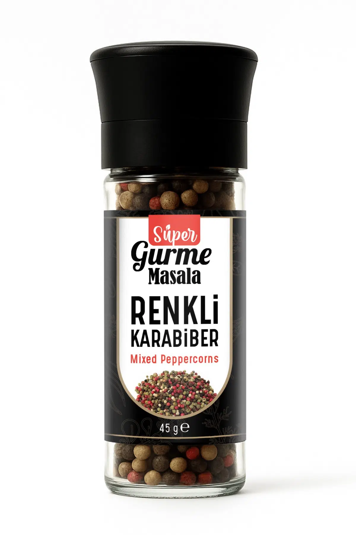 Renkli karabiber, karabiber karışımı, değirmen karabiber, dört renk karabiber, taze çekilmiş karabiber, masala baharat, cam ambalaj karabiber