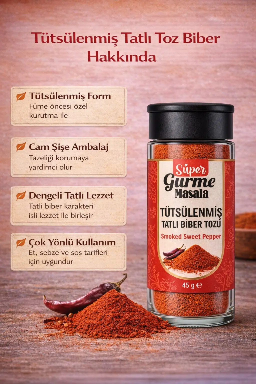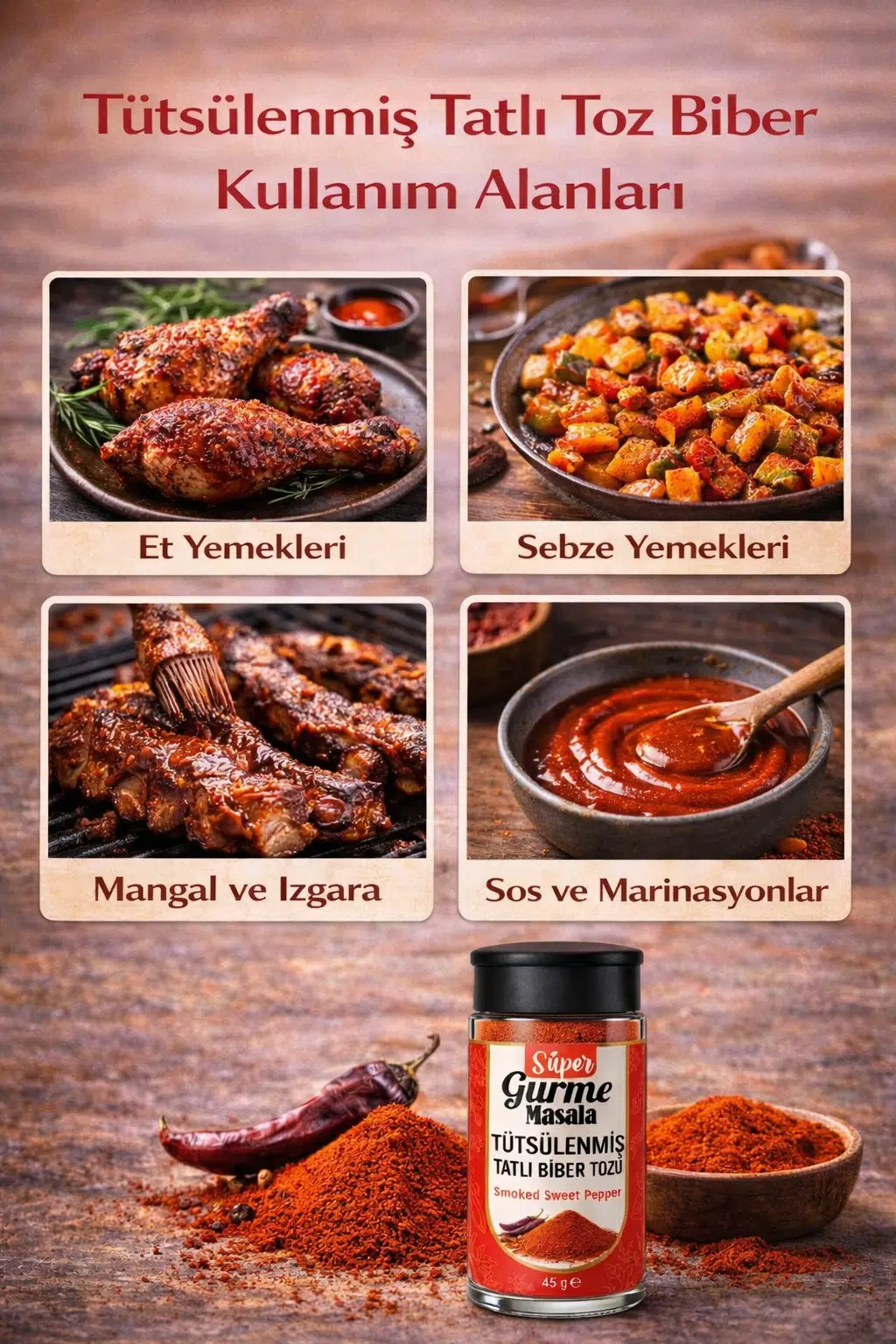 Tütsülenmiş tatlı toz biber özellikle et yemekleri, sebze tarifleri ve soslarda kullanılan aromatik bir baharattır. İsli aroması sayesinde yemeklere farklı bir lezzet katmanı kazandırır. Mangal, fırın yemekleri ve sos tariflerinde sık tercih edilir.